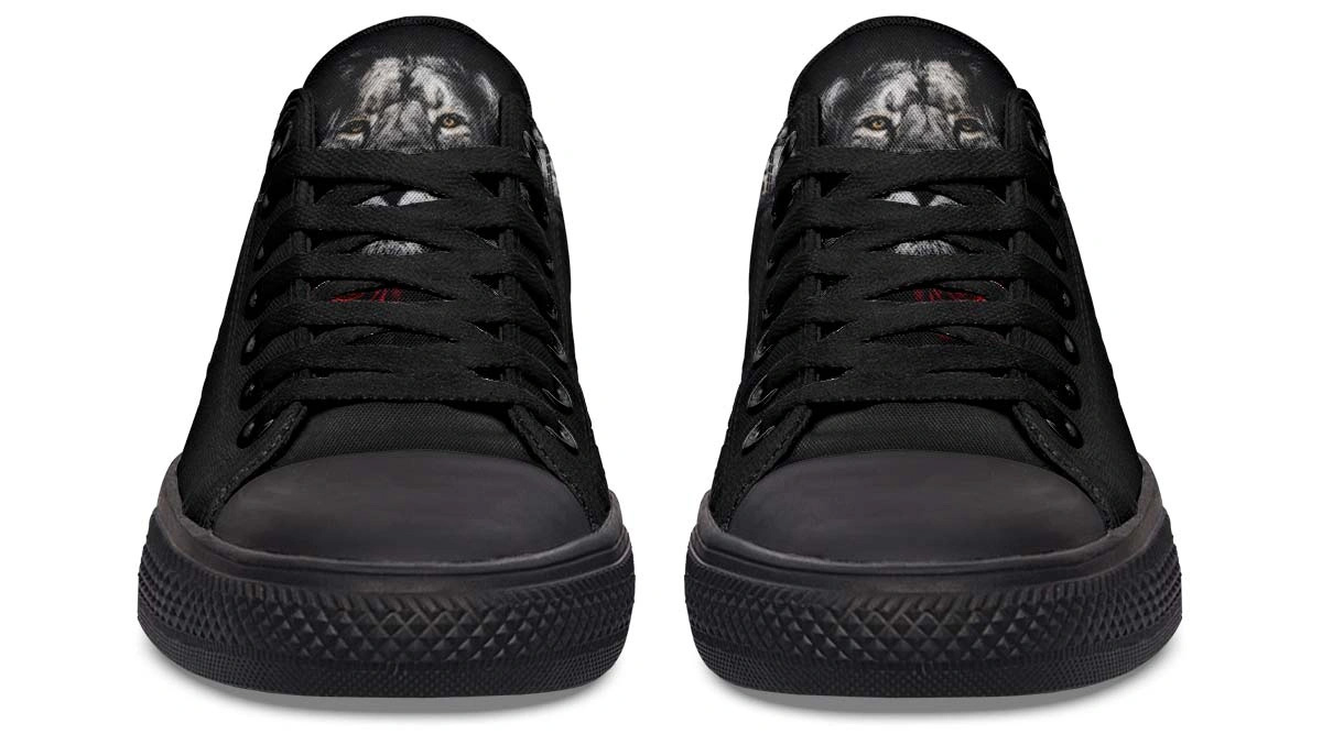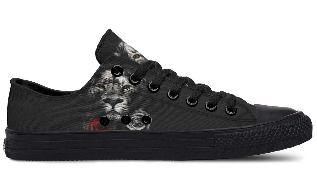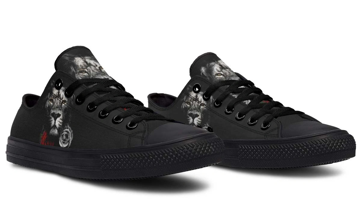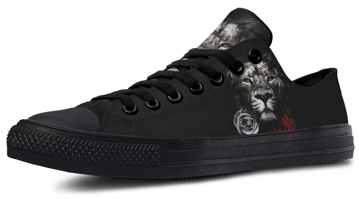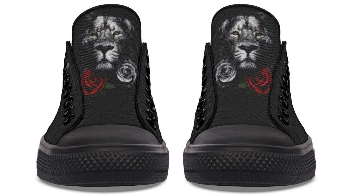 Roar with style in Lion and Rose Black Lowtop Sneakers. Premium comfort meets bold design in these versatile, sleek black shoes for everyday wear.