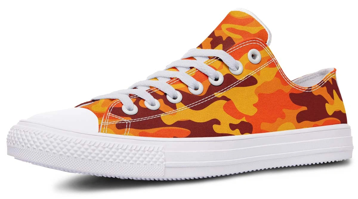 Upgrade your footwear collection with our Orange Camo Pattern White Low-Top Sneakers. These sneakers combine a vibrant orange camouflage print with a clean white base, creating a bold statement for any outfit. Engineered for durability and all-day comfort, the lightweight design ensures breathability whether you are hitting the city streets or meeting friends. Featuring a classic low-profile silhouette and high-quality construction, these fashion-forward sneakers are the ultimate addition to your trendy casual wardrobe.