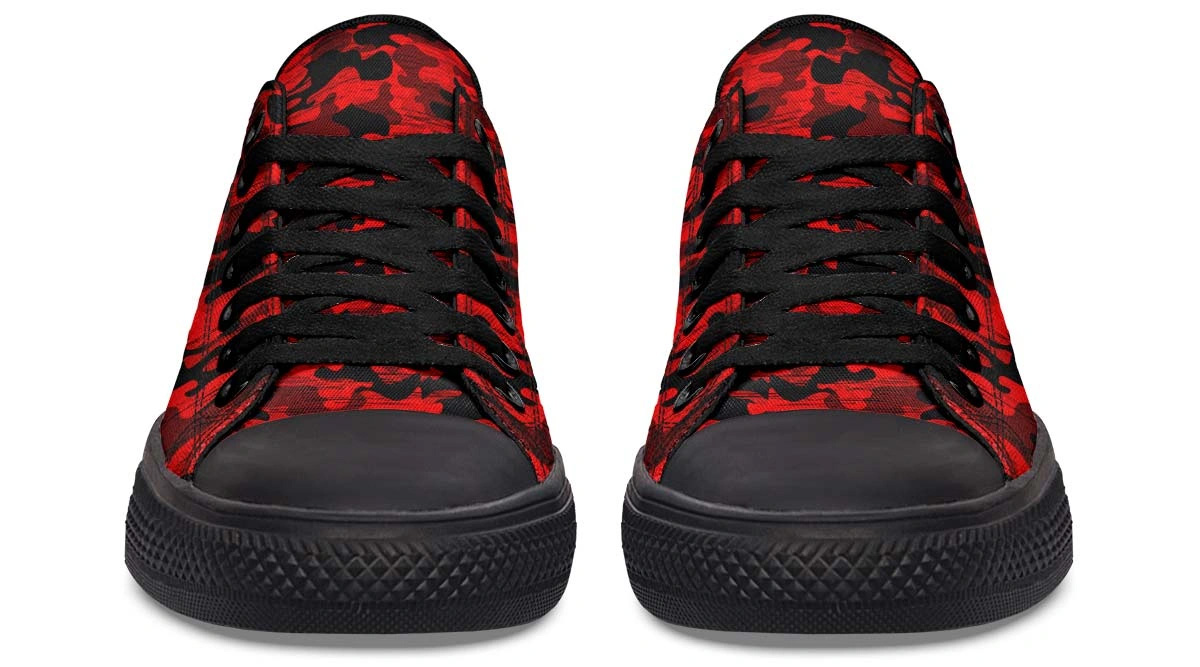 Step up your game with Red Camo Skull Low-Top Sneakers. Bold red camouflage and skull patterns create an edgy look for the ultimate urban fashion statement.